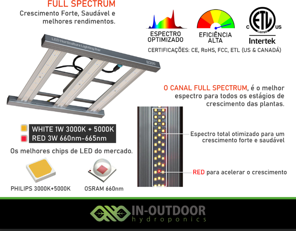 O cabal Full Spectrum das Bioledz Bar, é composto por LEDs de alta eficiência de cores brancas e vermelhas, formando um espectro completo e otimizado. Perfeito para o desenvolvimento completo de crescimento da planta, e com uma alta intensidade de luz que garantem o crescimento saudável, fortes e com altos rendimentos.