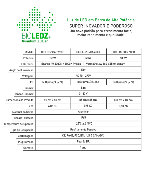ESPECIFICAÇÕES TÉCNICAS – BIOLEDZ QUANTUM BAR LED – FULL SPECTRUM – BAR 600B